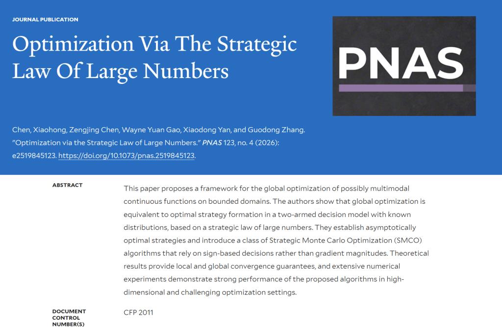 鱼乐达人 预聘制教授张国栋作为按姓氏排序、具有同等贡献的共同作者之一,与美国耶鲁大学Xiaohong Chen教授、山东大学陈增敬教授、美国宾夕法尼亚大学Wayne Yuan Gao教授、西安交通大学严晓东教授合作撰写的学术论文“Optimization via Strategic Law of Large Numbers”于2026年1月在国际顶级学术期刊《美国科学院院刊》(PNAS)正式发表。PNAS(Proceedings of the National Academy of Sciences)是与Nature、Science、Cell齐名的世界顶尖综合性学术期刊,在学术界具有广泛权威性,并在公众传播层面享有显著影响力。