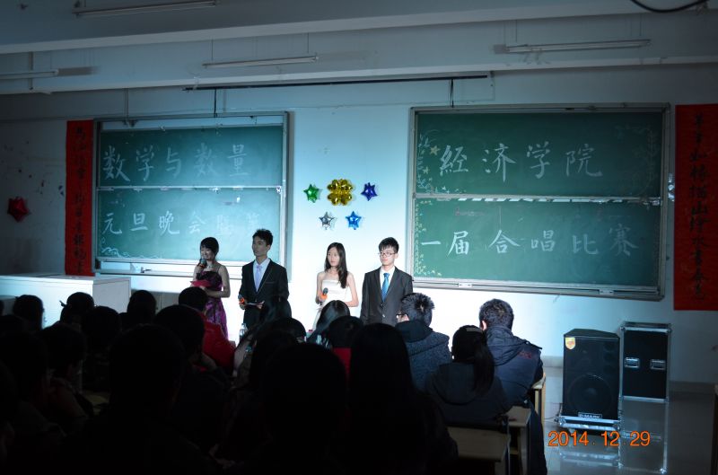 12月29日晚,,数学与数量经济学院于圣井校区B5201举办了第一届合唱比赛暨元旦晚会。学院2014级全体学生以班级为单位组建的6支团队参加了合唱比赛。赵连幸书记、燕文静老师与同学们一起观看了晚会。