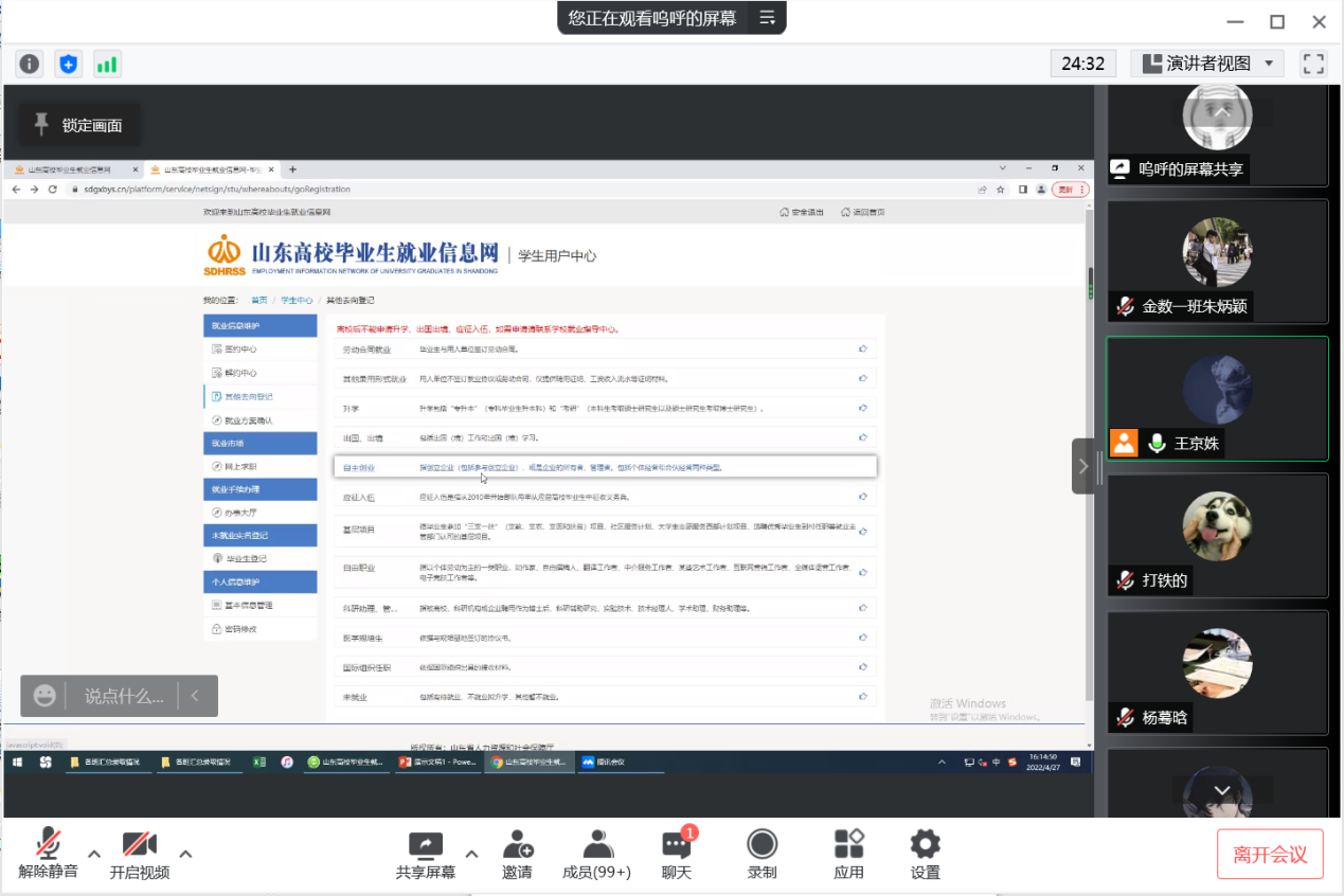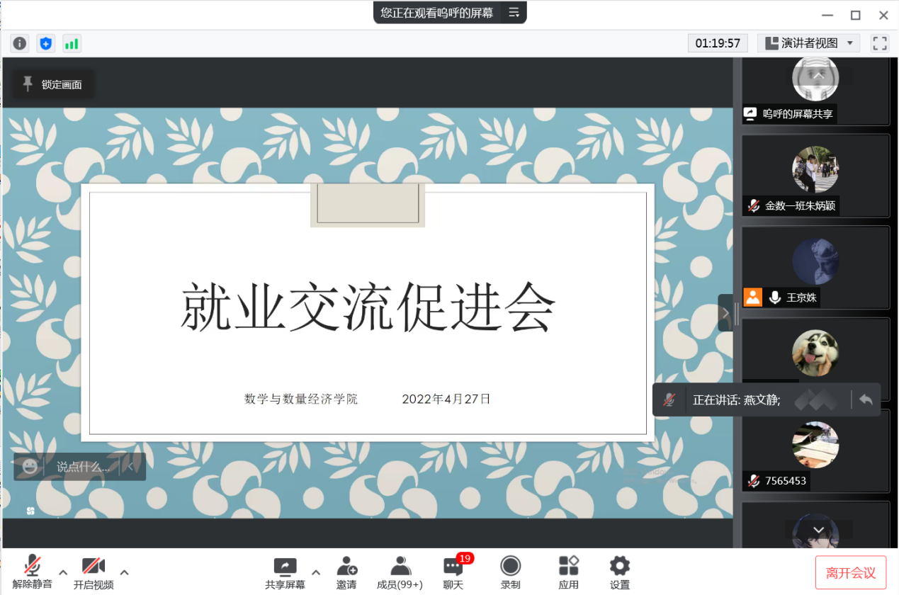 4月27日下午,2018级毕业生就业交流促进会在线上召开。鱼乐达人网页版 毕业班辅导员王京姝、就业办主任燕文静及2018级金融数学、数学与应用数学专业全体同学参加会议。会议开始前,学院通过多种方式,对毕业生目前面临的主要问题和思想动态做了调研,力图通过本次会议有针对性地解决就业实际问题,推动高质量就业。