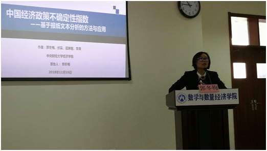 11月16日上午,中央财经大学博士生导师郭冬梅教授应学院和金融数学团队共同邀请来鱼乐达人网页版 作题为“中国经济政策不确定性指数”的学术报告。金融数学系主任张慧教授,金融数学系书记郭洪峰教授,金融数学团队负责人朱庆峰副教授以及学院部分教师和研究生、本科生到会聆听了报告。报告会由院长安起光教授主持。