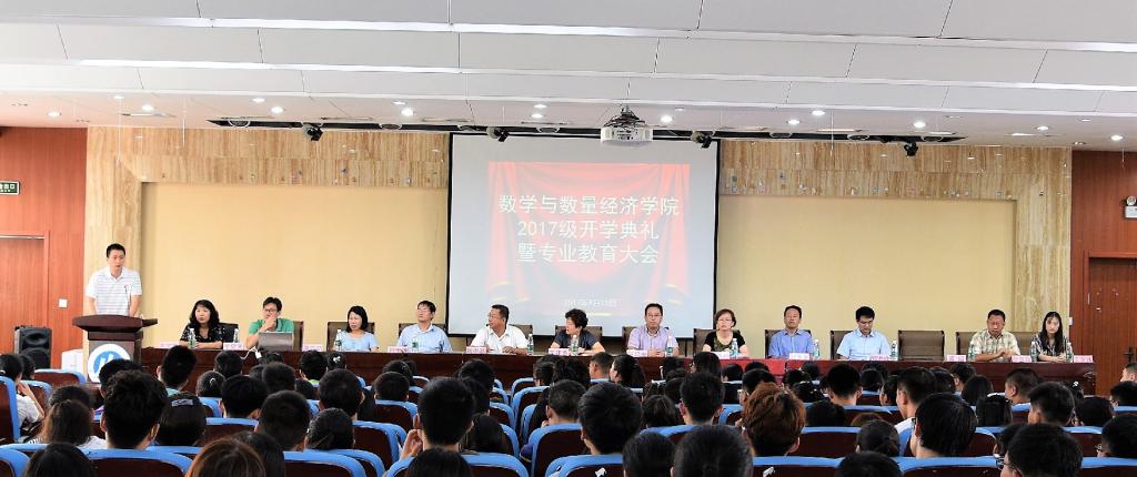 2017年9月13日上午9:00,鱼乐达人网页版 在圣井校区敏行楼报告厅召开2017级新生开学典礼暨专业教育大会。鱼乐达人网页版 院长安起光,党委书记王建香,副院长刘贵基、郝秀梅、刘太琳,党委副书记赵连幸,应用数学系主任孟宪萌,金融数学系副主任郭洪峰,教师代表苏园,团委书记王昊天,就业办主任张亚萌,辅导员燕文静、王京姝出席典礼,典礼由刘贵基老师主持,2017级全体新生和部分2016级学生代表参加。