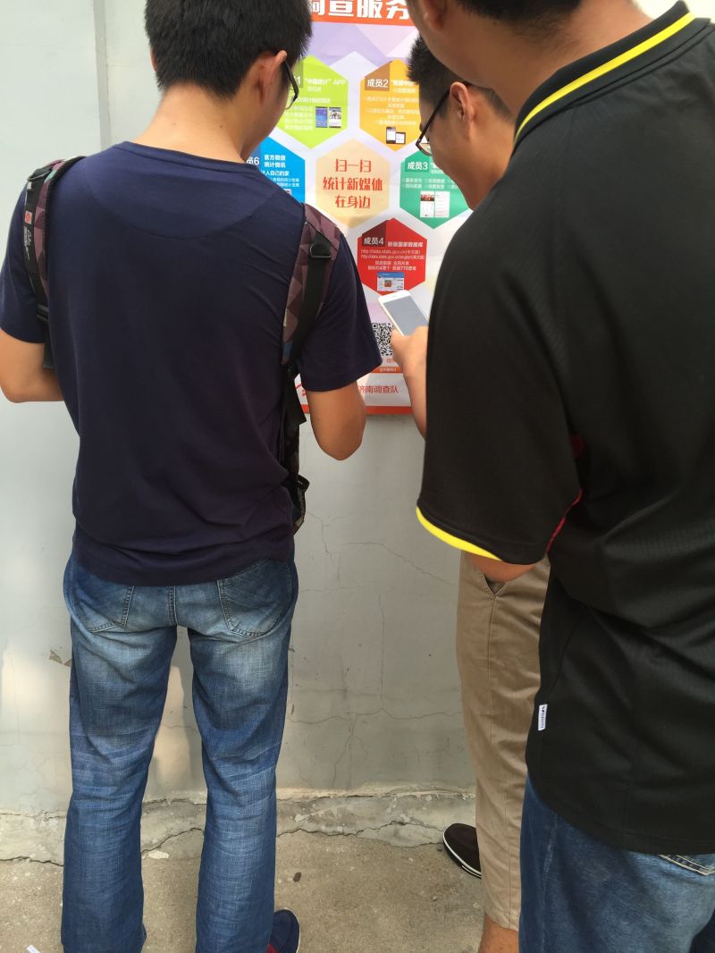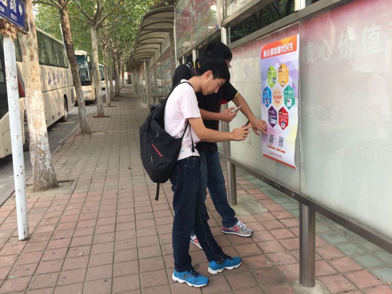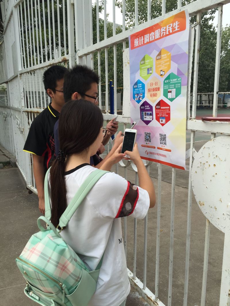 活动当天,济南队到我校开展了一系列现场宣传活动,包括在教学楼大厅内摆放宣传展板和分发《统计法》宣传单页。展板内容主要分为中国统计开放日的简介和历史沿革、统计新媒体的特色和使用方法两部分,并由济南队的业务骨干进行全程讲解,向我校师生解读农业、居民收入、农民工、价格、就业等民生统计调查数据、调查方法。同时,济南队还印制了“中国统计开放日”宣传海报,推广国家统计局的官方APP(中国统计、数据中国、掌上数据库)和微信公众号,帮助广大师生通过手机新媒体,随时随地查询相关统计调查的资料数据,以大数据的形式,加速实现调查数据全民共享化。