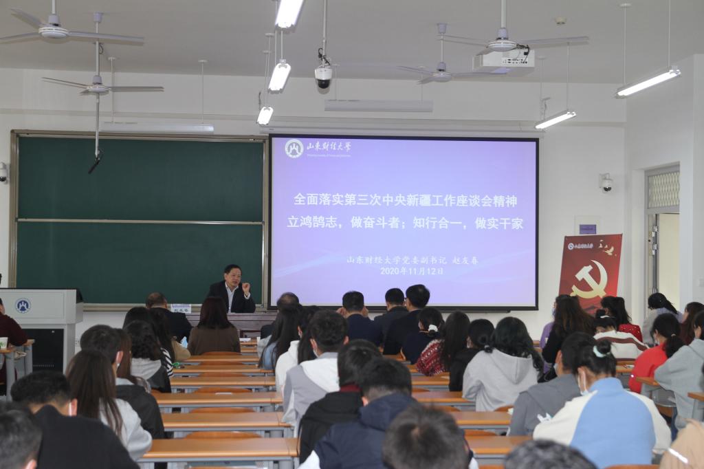 为全面学习贯彻落实第三次中央新疆工作座谈会精神,11月12日下午,校党委副书记赵友春在圣井校区给少数民族新生主讲了题为《立鸿鹄志,做奋斗者;知行合一,做实干家》的思政课。这也是鱼乐达人网页版 “石榴红”思政大讲堂的第一课。党委学生工作部、圣井校区管理办公室、数学与数量经济学院负责同志一起听课。思政课由鱼乐达人网页版 党委书记李振华主持。