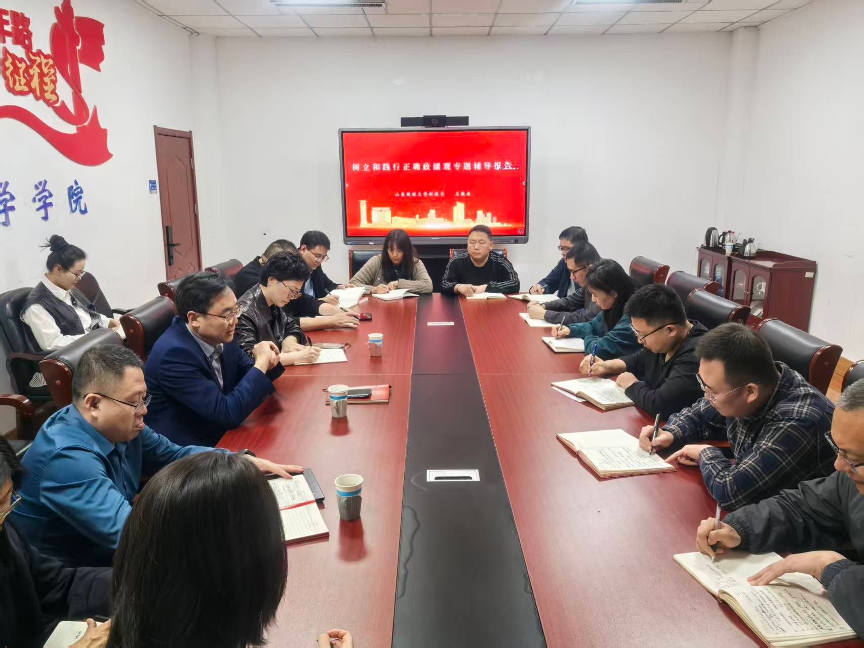 为深入贯彻落实关于树立和践行正确政绩观的重要指示精神,扎实推进学习教育走深走实,切实将学习成果转化为推动高质量发展的实际成效,3月27日,山东财经大学副校长王敬政莅临学院开展调研指导,并讲授“树立和践行正确政绩观”专题党课。会议由学院党委书记齐杨主持,学院全体班子成员及行政管理人员参加。