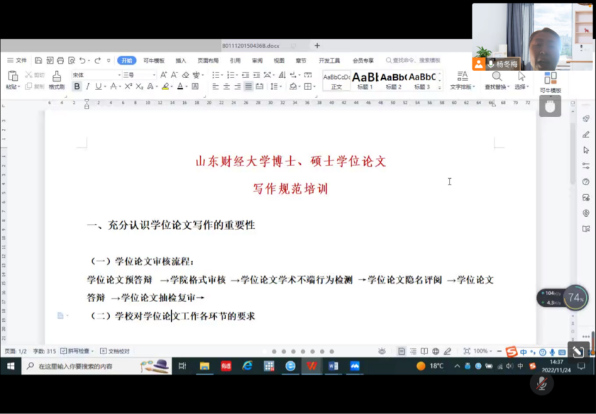 为规范论文格式,保证学位论文质量,11月24日下午,鱼乐达人网页版 特别邀请博士生导师杨冬梅教授线上开展2023届毕业研究生学位论文写作规范培训工作,统计交叉科学研究中心主任兼鱼乐达人 副院长田金方教授主持专题讲座,2023届全体毕业研究生参加本次培训会议。