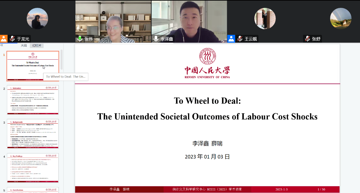 1月3日下午,统计交叉科学研究中心(RCSIS)2023年系列学术讲座第1讲在“云”端顺利开讲。中国人民大学国家发展与战略研究院博士后李泽鑫研究员应邀做客本次学术讲座,并做了主题为“To Wheel to Deal: The Unintended Societal Outcomes of Labour Cost Shocks”的学术报告。本次讲座由山东财经大学博士生导师张伟教授主持,近百名老师、硕博士研究生参加了本次讲座。