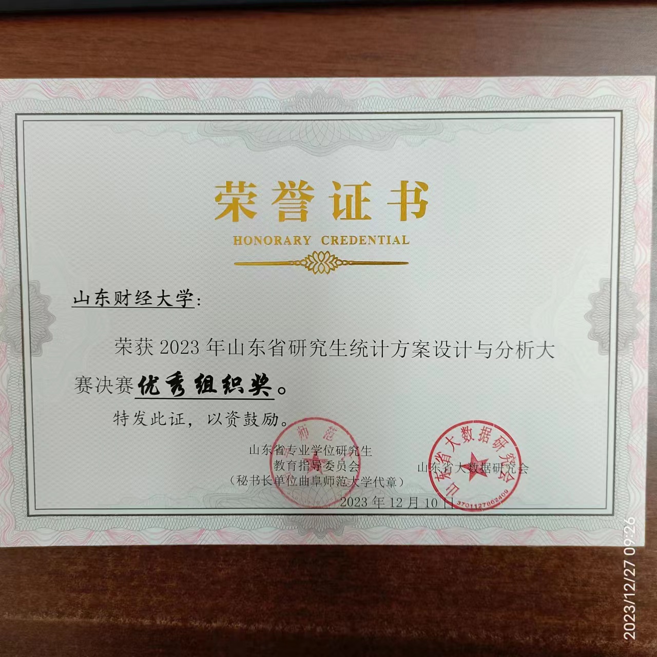 近日,2023年山东省研究生统计方案设计与分析大赛决赛在曲阜师范大学落下帷幕,鱼乐达人网页版 参赛研究生团队获得一等奖3项、二等奖2项、三等奖7项,杨冬梅、刘爱芹、孔凡超、万道侠四位老师荣获优秀指导教师称号,山东财经大学获颁优秀组织单位奖。