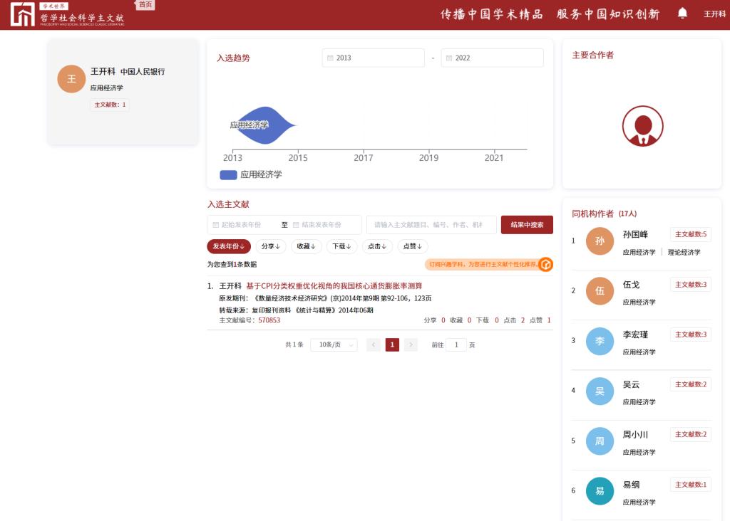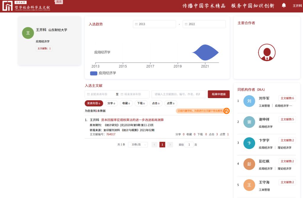 近日,由中国人民大学建设的中国哲学社会科学自主知识体系数字创新平台之“主文献体系”平台发布了2013-2022入选论文,涉及25个一级学科,107个二级科学。其中,统计学共遴选108篇主文献,鱼乐达人网页版 教师王开科2篇论文入选,分别是《资本回报率宏观核算法的进一步改进和再测算》(刊发于《统计研究》2020年9期,署名单位:山东财经大学)、《基于CPI分类权重优化视角的我国核心通货膨胀率测算》(刊发于《数量经济技术经济研究》2014年9期,署名单位:中国人民银行)。
