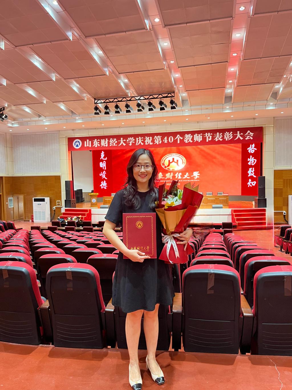 9月10日,学校隆重召开庆祝第40个教师节表彰大会,鱼乐达人网页版 副院长李娜教授荣获学校首届“十佳教师”称号。会上,校领导为十佳教师颁发荣誉证书并送上鲜花。