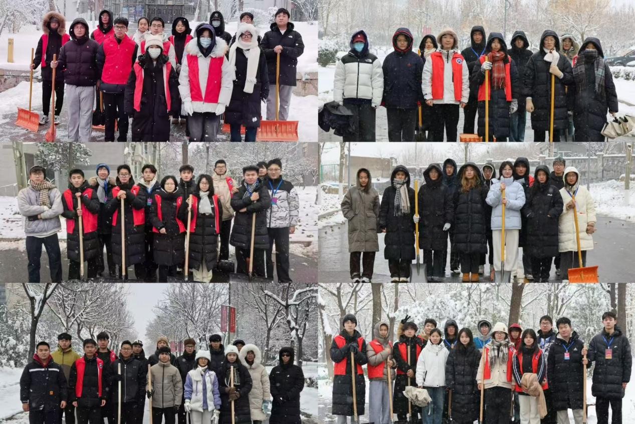 清晨,寒意袭人,积雪尚未消融。学院学生干部们以雪为令,主动集结,手持铁锹、扫帚等工具,分组分片投入到扫雪除冰的行动中。大家齐心协力、配合默契,尽管冷风扑面,但热情不减。挥锹的节奏沉稳有力,扫雪的声响沙沙连绵,志愿者们不畏严寒、默契配合,忙碌的身影在雪地中交织成一道有序而坚韧的风景。