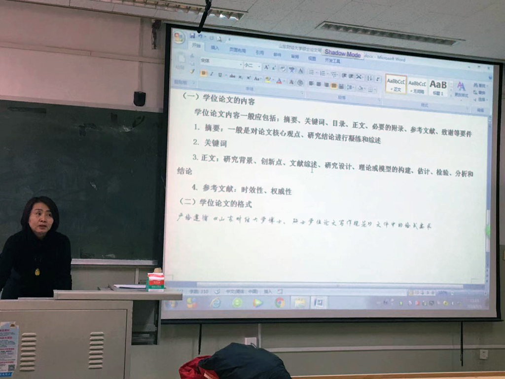 为保证学位论文质量,规范论文格式,按研究生院要求,鱼乐达人网页版 于1月3日下午两点在1505举办2019届毕业研究生学位论文写作规范培训讲座,邀请鱼乐达人网页版 在学科专业经验丰富的杨冬梅教授主讲,杨教授详细分析了研究生在论文写作过程中论文规范方面需要注意的问题及事项,并与学生一起学习了与学位申请相关的文件,让学生知悉学术不端行为检测、论文隐名评阅、论文答辩、论文抽审等学位申请环节的文件规定。