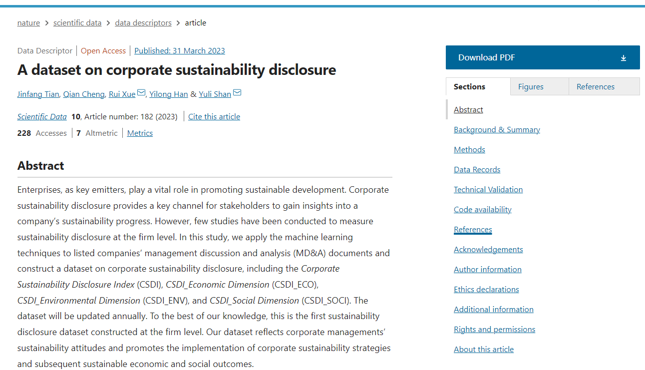 近日,鱼乐达人 (统计交叉科学研究中心)田金方教授合作团队构建的企业可持续性信息披露指数以期刊论文“A dataset on corporate sustainability disclosure”的形式发表于Nature子刊《Scientific Data》(//doi.org/10.1038/s41597-023-02093-3)。该期刊实时影响因子12.5,JCR分区Q1,系我校A1类期刊。