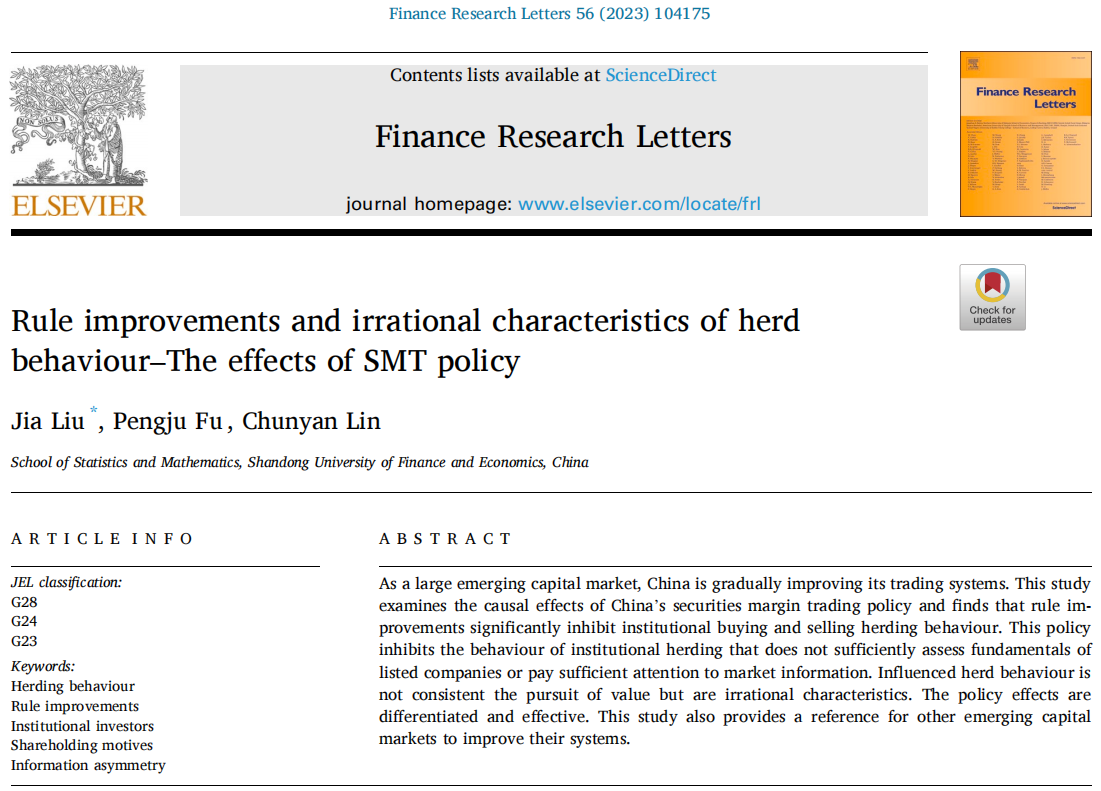 鱼乐达人 教师刘佳作为第一作者与硕士研究生付鹏举、林春艳教授合作的论文“Rule improvements and irrational characteristics of herd behaviour—The effects of SMT policy”在期刊Finance Research Letters正式发表(2023年第56卷)。该期刊为SSCI一区期刊,期刊最新影响因子为10.4,在BUSINESS, FINANCE大类中排名1/111,属我校A1类期刊。