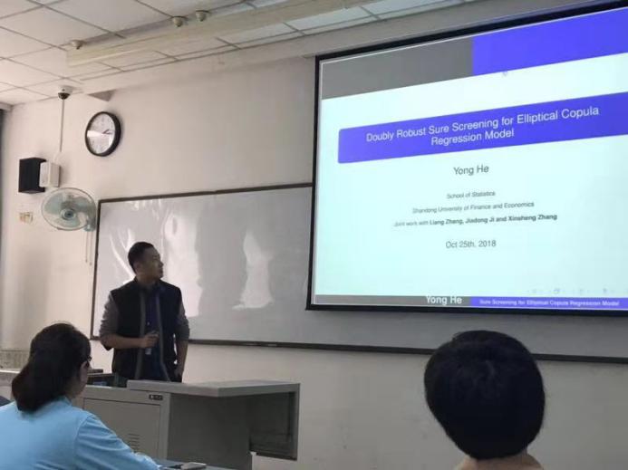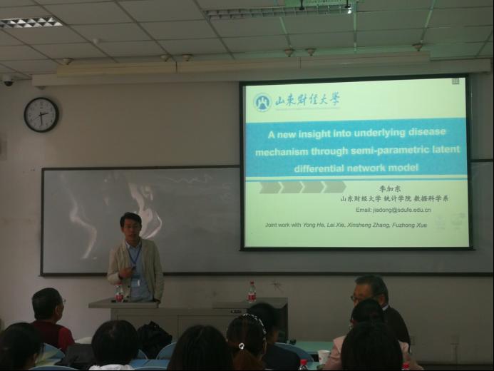 鱼乐达人网页版 派出数理统计系的戴洪帅、何勇、季加东、于渊、孔令涛、郝涛等六位教师代表参加了此次会议。会议期间,戴洪帅老师做了题为“Stationary Distributions for Two-Dimensional Sticky Brownian Motion: Exact Tail Asymptotics and Extreme Value Distributions”的报告,何勇老师做了题为“Doubly Robust Sure Screening for Elliptical Copula Regression Model”的报告,季加东老师做了题为“A New Insight into Underlying Disease Mechanism Through Semi-parametric Latent Differential Network Model”的报告。