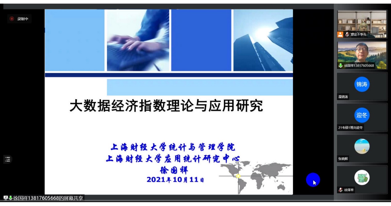 10月11日晚上,统计学院“百脉大讲坛”第96讲通过腾讯会议线上平台顺利举行。上海财经大学统计与管理学院国家二级教授、应用统计研究中心主任、上海社会调查研究中心上海财经大学分中心主任徐国祥教授应邀做客本次讲坛,做了题为“大数据经济指数理论与应用研究”的学术报告。统计学院部分教师、全体博士硕士研究生,通过会议客户端参与了本次学术活动。报告会由院长李国锋教授主持。