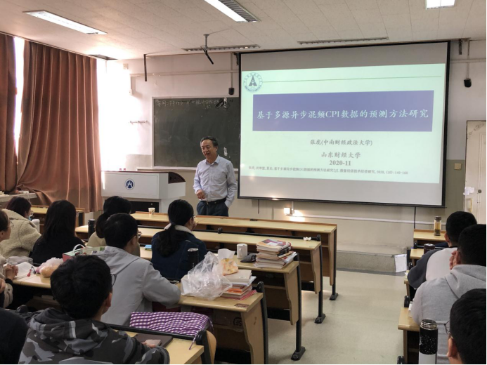 2020年11月15日上午,中南财经政法大学张虎教授应邀来鱼乐达人网页版 进行学术交流并做了题为“基于多源异步混频CPI数据的预测方法研究”的学术报告,会议在一号教学楼1505举行,学院2020级全体研究生参加了此次交流,报告会由田金方副院长主持。
