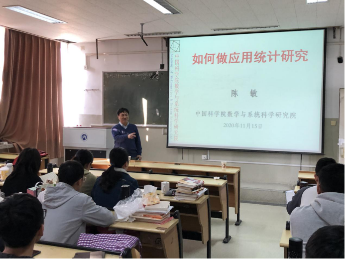 2020年11月15日上午,中国科学院数学与系统科学研究院陈敏教授应邀来鱼乐达人网页版 进行学术交流并做了题为“如何做应用统计研究”的学术报告,会议在一号教学楼1505举行,学院2020级全体研究生参加了此次交流,报告会由李国锋院长主持。