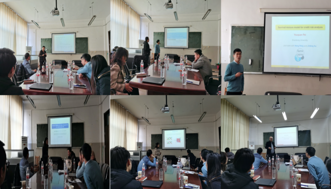本次会议邀请了优秀青年学者作报告交流。上半场,山东大学经济学院严晓东副教授做了题为“Simultaneous estimation and group pattern recovery for censored liner regression”的专题演讲,主要针对个性化医疗的的应用背景,介绍了一种能够解决个性化医疗问题的统计模型,并结合Buckley-James迭代过程和乘数的交替方向方法对模型进行求解,并证明了该方法具有很好的性质。山东财经大学统计学院季加东副教授演讲了其研究论文“A Machine Learning Method for Identifying Critical Interactions between Gene Pairs in Alzheimer's Disease Prediction”,该论文以阿尔兹海默症为背景,应用一种新的机器学习方法对其进行预测,并与主流的机器学习预测方法进行比较,验证了论文所提出的方法的优越性。山东大学经济学院裴有权副教授以“Survival mixture model for credit risk analysis”为题展示了其近期的研究成果,该成果提出了一种基于生存分析的新统计方法,不仅可以建模是否违约,而且可以预测发生违约的时间,为信用风险问题提供了一种解决方案。