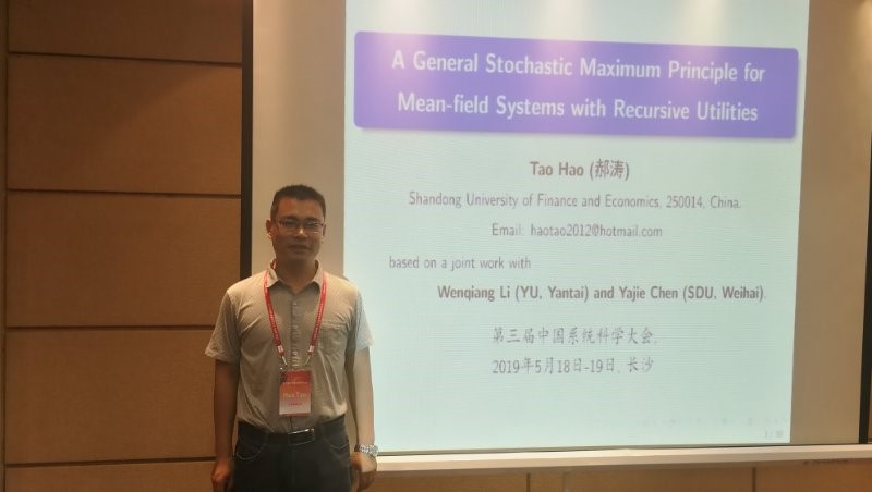 2019年5月18日至19日,鱼乐达人网页版 郝涛老师应邀参加在长沙举办的第三届中国系统科学大会,并做题目为“A General Stochastic Maximum Principle for Mean-field Systems with Recursive Utilities ”的报告。大会由上海系统科学研究院主办,国防科技大学承办,中国科学院数学与系统科学研究院系统科学研究所、北京师范大学系统科学学院、北京交通大学交通系统科学与工程研究院、中国船舶工业系统工程研究院、中国系统工程学会、中国自动化学会控制理论专业委员会等单位协办。旨在为系统科学及其相关领域的国内外专家学者提供一个学术交流平台,促进相关学科的交流、发展和融合,促进新方向、新领域的产生。