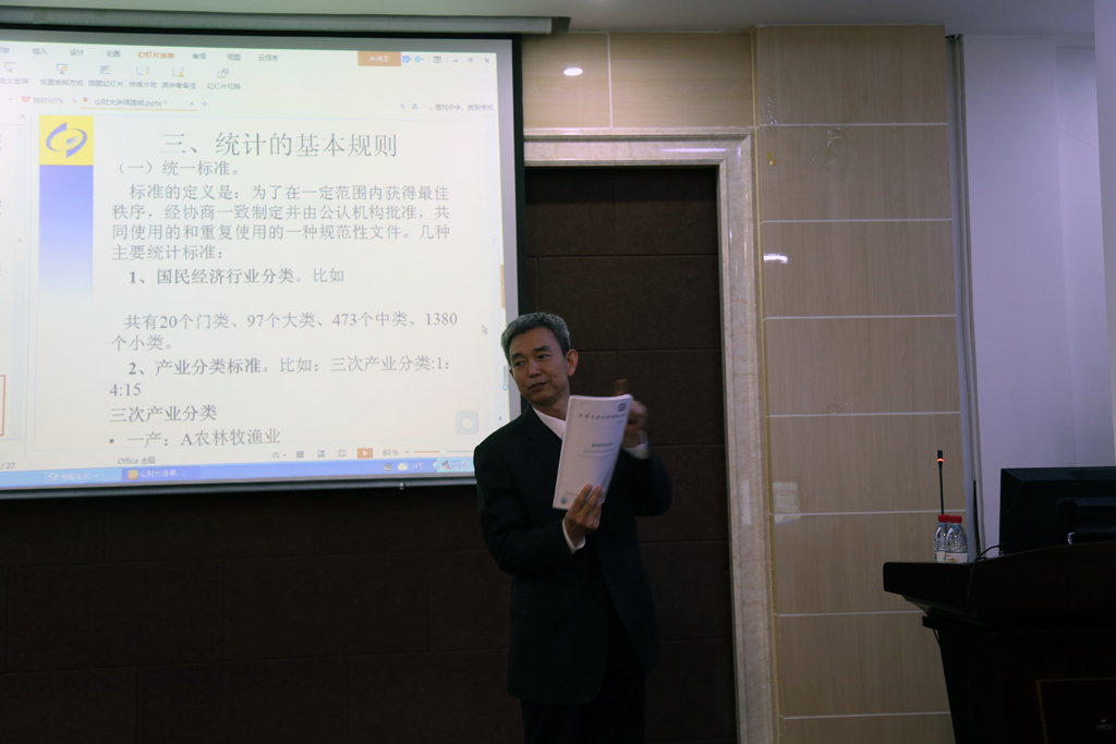 3月28日下午,为落实山东财经大学与山东省统计局签署的战略合作协议,共建高水平“产学研”合作平台,统计学院“百脉大讲坛”在燕山校区4号教学楼6楼报告厅开讲,主讲人为山东省统计局姜西海调研员。讲座由执行院长李国锋主持,学院党委书记郑磊、副院长田金方和全体研究生聆听了讲座。