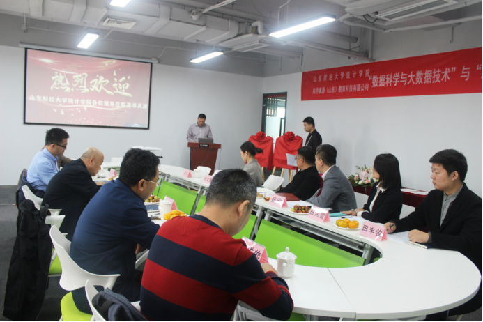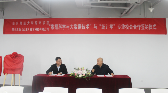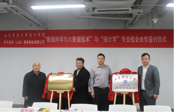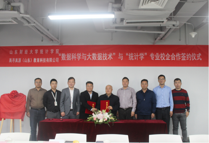 为进一步强化校企合作办学,推动产学研深度融合,2020年10月16日,山东财经大学统计学院与高寻真源(山东)教育科技有限公司举办关于“数据科学与大数据技术”“统计学专业”校企合作签约仪式。山东财经大学统计学院党委书记郑磊、院长李国锋、党委副书记赵世民、副院长裴海峰、实验室主任任文东、数理统计系副主任戴洪帅以及高寻真源(山东)教育科技有限公司执行董事张欣、副总经理韩帅、副总经理徐冉、运营管理中心经理田瑞雪、技术研发中心主管田丰收、售前工程师杨文雅等参加了此次签约仪式。仪式由高寻真源(山东)教育科技有限公司副总经理徐冉主持。