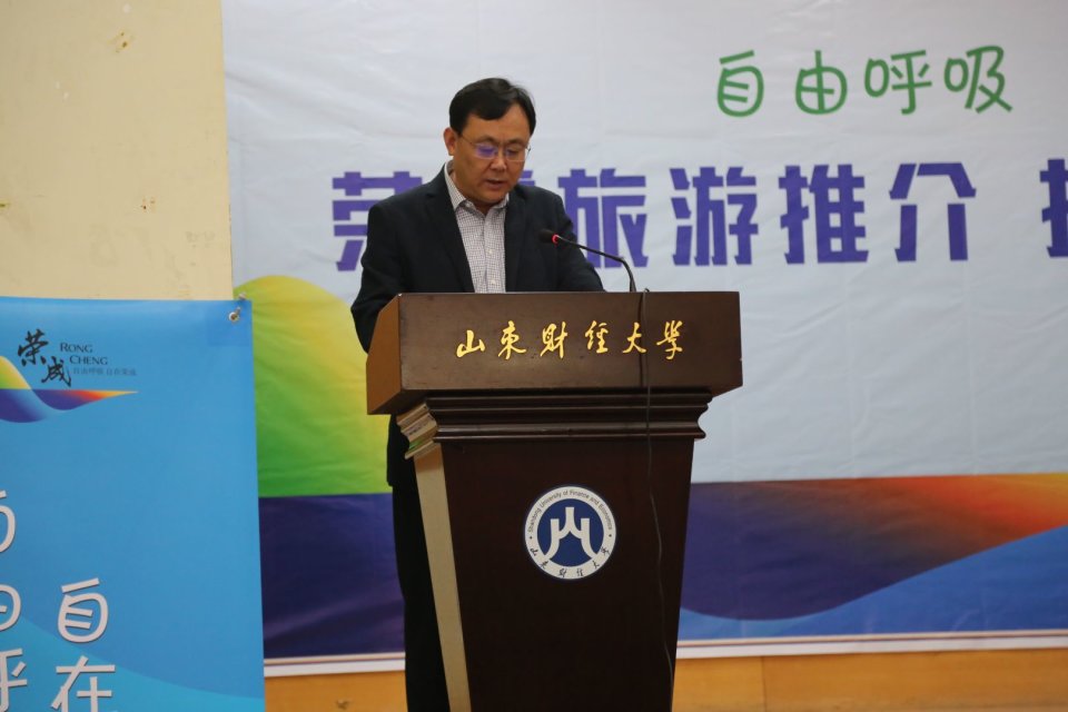 荣成市旅游局局长张万军在致辞中对统计学院承办这次活动表示了感谢与支持。他介绍了荣成市在旅游方面的优势,荣成市当前急需要人才,对于大学生来说就业机会多,尤其是荣成市实施了“百千万英才计划”,先后出台了高端人才、创业人才、产业紧缺人才、柔性高层次人才和大学生聚荣等多方面引才计划,对前来就业的大学生提供福利与保障。山东财经大学是一所办学历史悠久,培养学生优秀的知名高校,希望通过校地合作,能为荣成注入更多新鲜的血液。