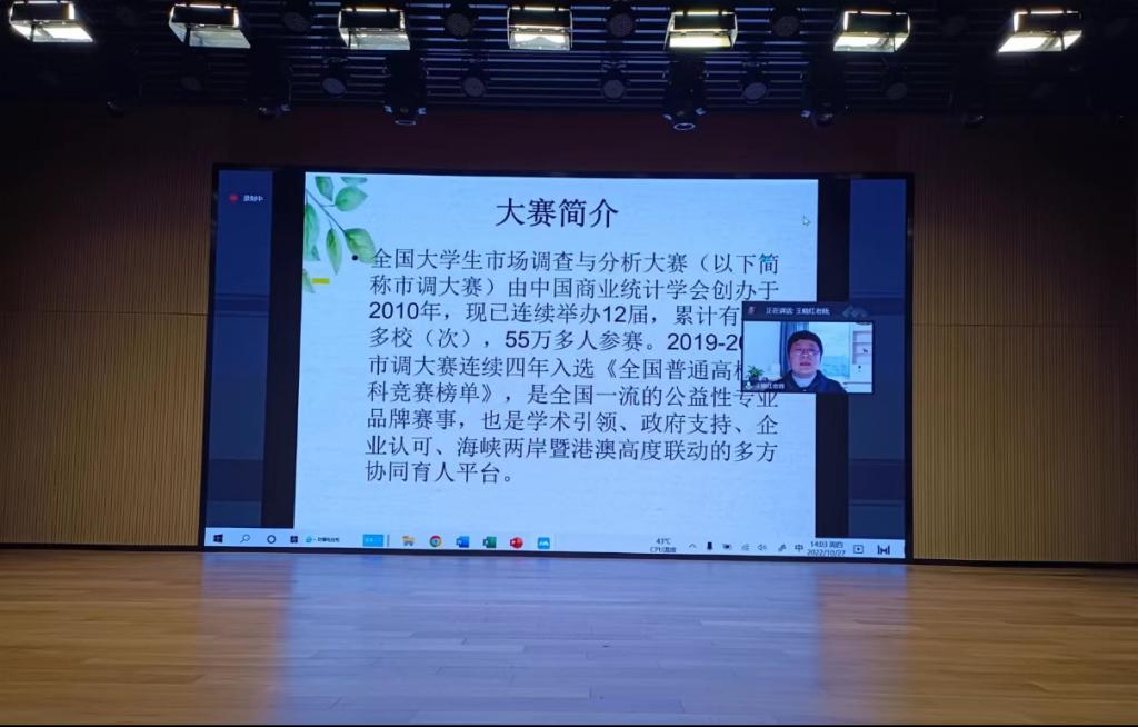 会议伊始,王晓红老师首先介绍了市场调研大赛,并根据自身指导经验给予关于选题、数据收集、组队方面的意见,希望学生在参赛时可以更大程度上发挥项目的最大化优势,并在关于大一学生参赛问题中指出参加市场调研大赛可以使学生的团队协作、检索信息能力等得到更大提升,也给予不熟悉竞赛的同学以鼓励和建议。